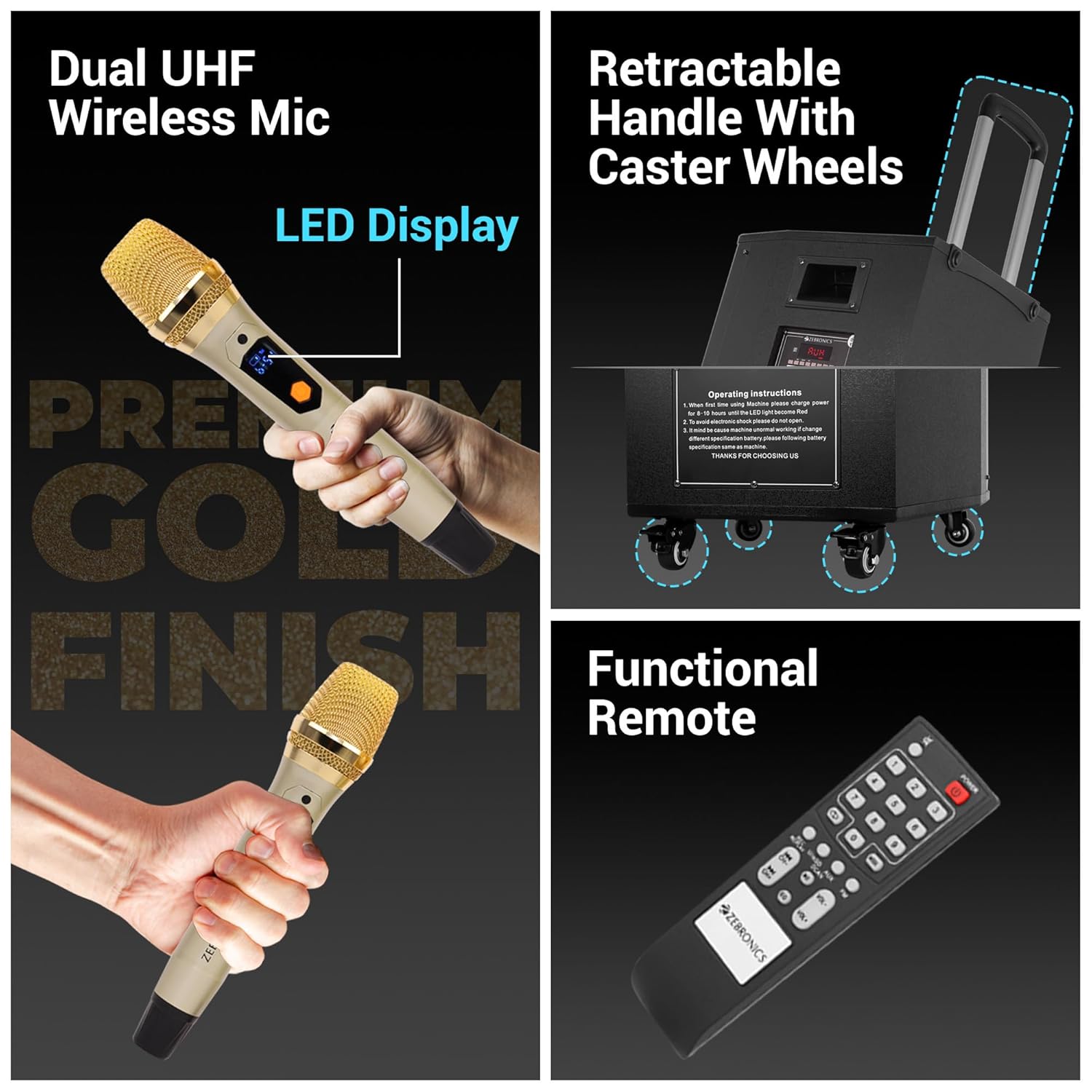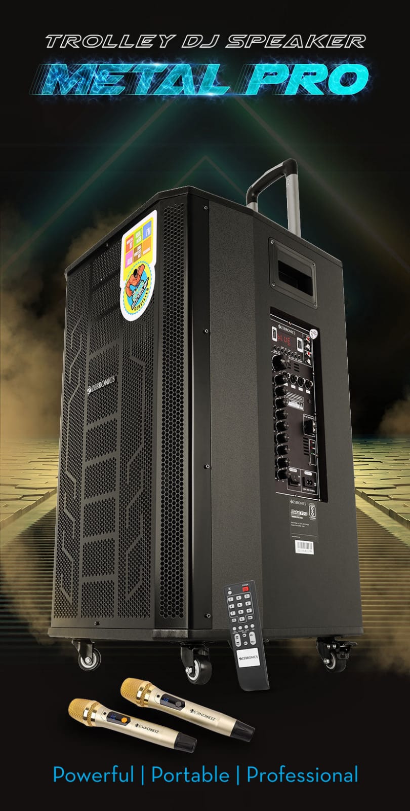 ZEBRONICS Metal Pro Powerful DJ Trolley Speaker with UHF Wireless Mic, Karaoke, TWS, 150W RMS Output, Built-in Rechargeable Battery, 15″ Driver, 2X USB Input & Remote Control, Black