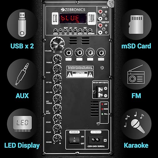 Be the first to review “ZEBRONICS Metal Pro Powerful DJ Trolley Speaker with UHF Wireless Mic, Karaoke, TWS, 150W RMS Output, Built-in Rechargeable Battery, 15″ Driver, 2X USB Input & Remote Control, Black”